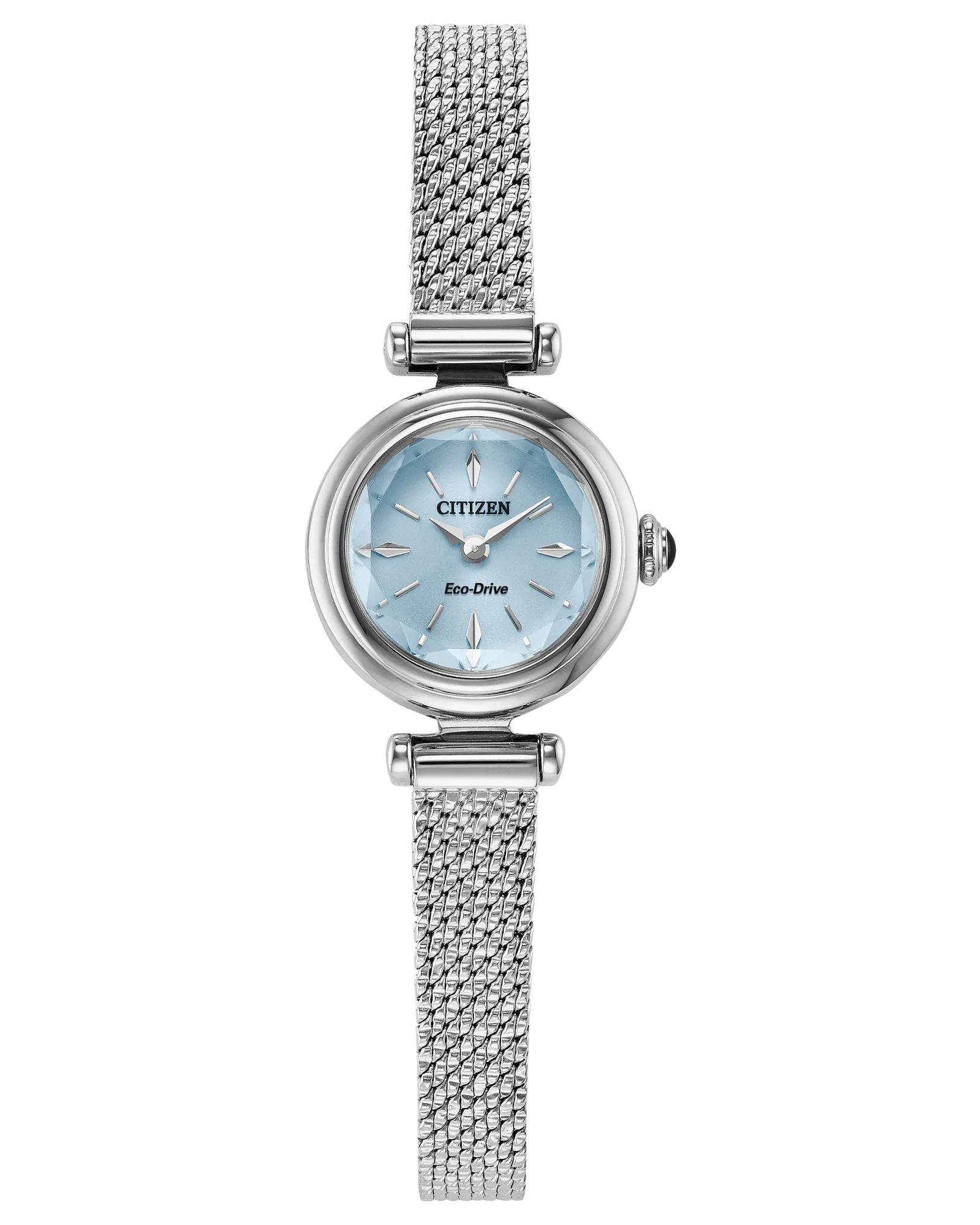 Measuring a delicate 18.4mm, the round silver-tone stainless steel case is accented by distinct lugs and a faceted mineral crystal that sparkles as it catches the light. A blue cabochon-set crown lends a graceful flourish, while the ultra-slim stainless steel bracelet enhances the design’s sophisticated, jewelry-inspired presence. On the light blue sunray dial, applied indices and sword-style hands offer a clean, minimalist presentation that places elegance front and center. Water resistant up to 30 meters. Calibre G626.