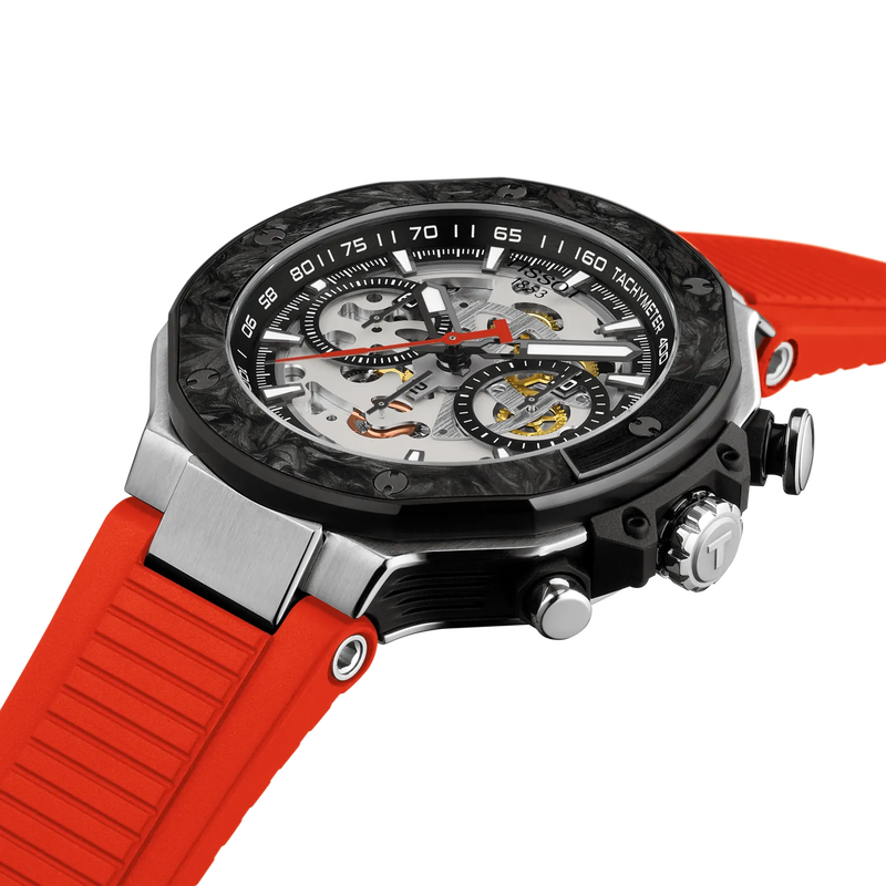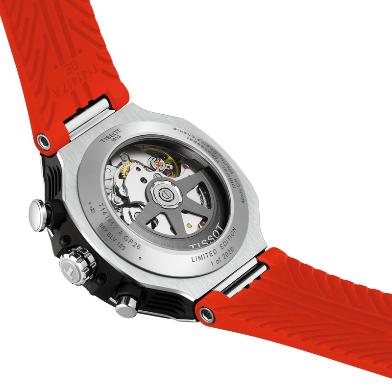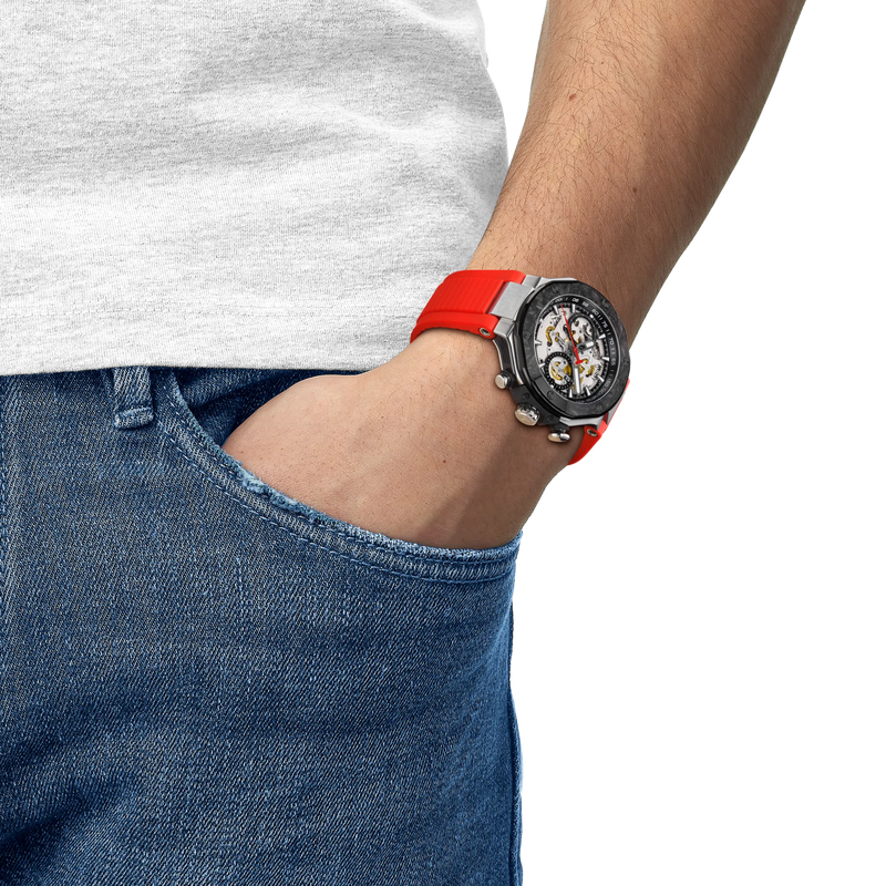 To celebrate over two decades of partnership with MotoGP™, the iconic T-Race collection inspired by racing bikes, expands in 2026 with new references, including this exclusive Automatic Valjoux Chronograph skeleton model. This automatic version features a well-known Valjoux A05 movement with a power reserve of 68 hours - a true reflection of the mechanical innovation that defines MotoGP, where each component is meticulously designed and optimised with the sole purpose of achieving maximum performance. The watch’s design is complemented by a brake-disc bezel, see-through dial, and a rubber strap inspired by motorcycle engine parts. Limited to 2 026 pieces, it is delivered in the signature helmet-shaped box.