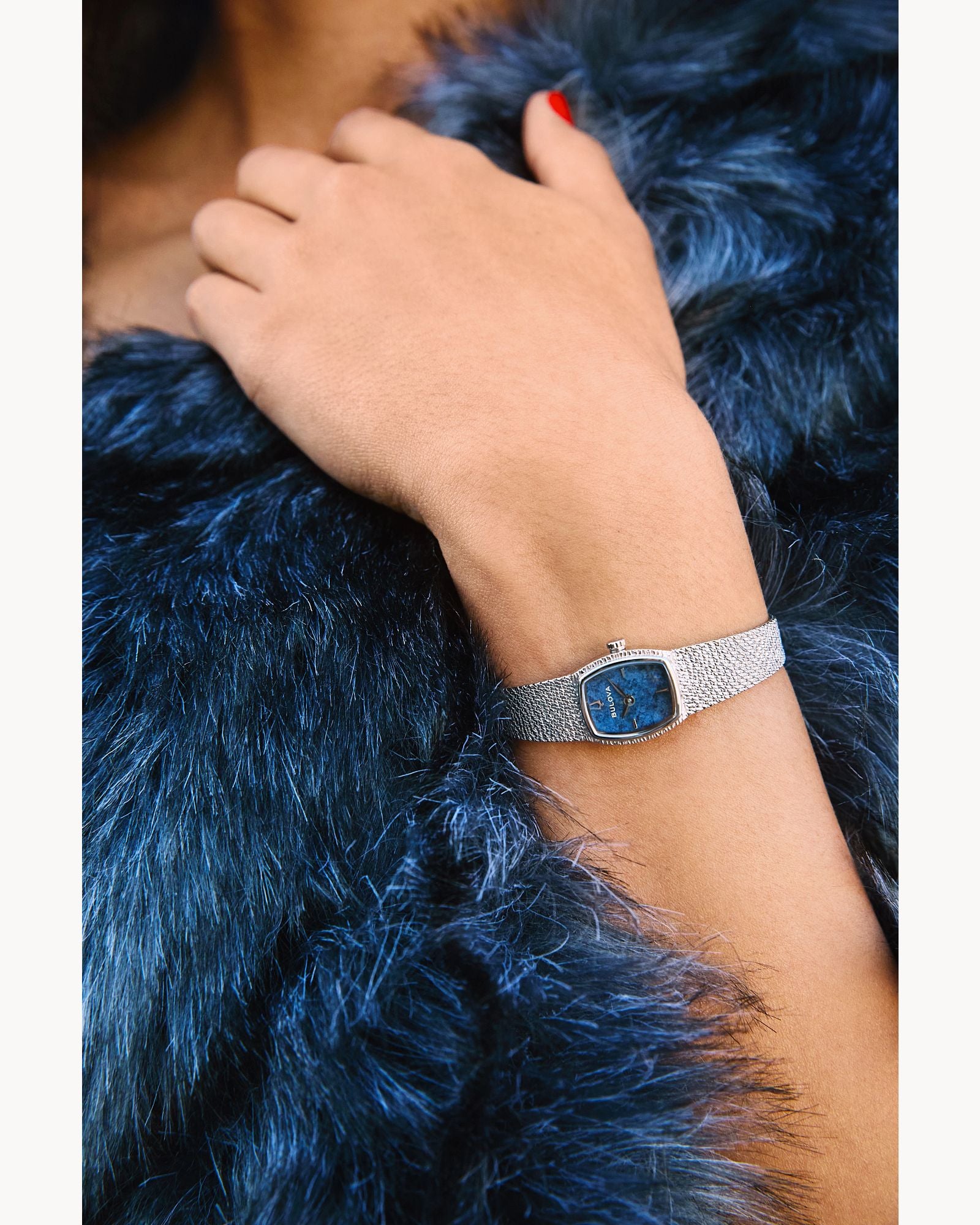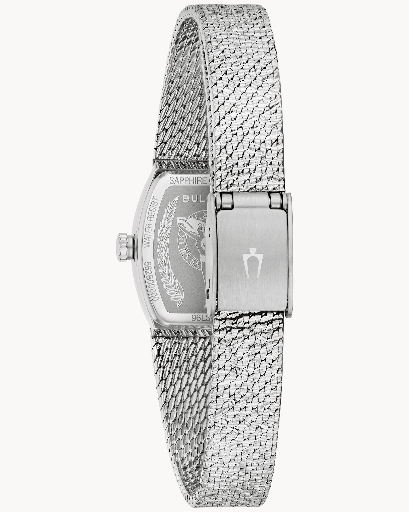 Step back in time to the glitz and glam of the 1970s with the Bulova women’s Classic “Goddess of Time” watch. Borrowing the timeless design of vintage Bulova “Goddess of Time” watches, the silver-tone stainless steel tonneau case has a textured top and a brightly polished bezel, seamlessly transitioning to a textured mesh bracelet. Each variegated genuine blue sodalite stone dial is completely unique and is appointed with silver-tone applied markers and matching hands, while Bulova’s Goddess of Time herself is etched onto the case back in intricate definition. Feel truly divine in this stunning Bulova ladies’ timepiece.