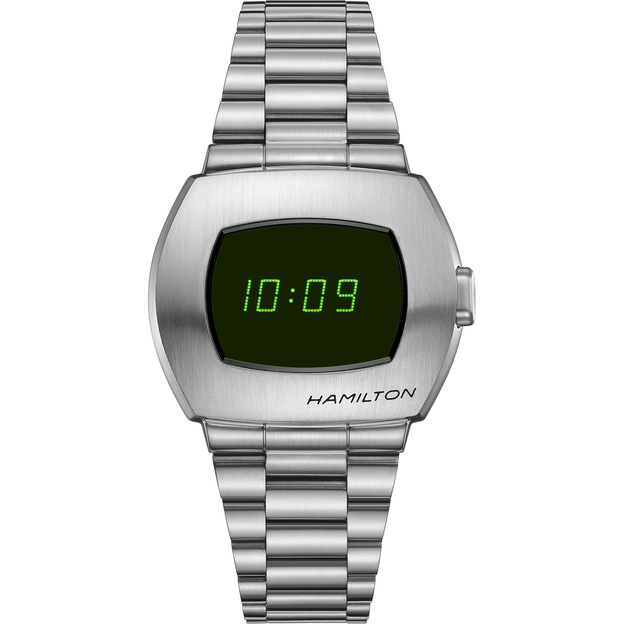 The story of innovation synonymous with the debut of the world's first digital watch in 1970 continues with a new model of our iconic Hamilton PSR Digital Quartz. Featuring a hybrid LCD and OLED digital display, its green digit-dot numerals can be read at a glance during the day and with the push of a button at night.