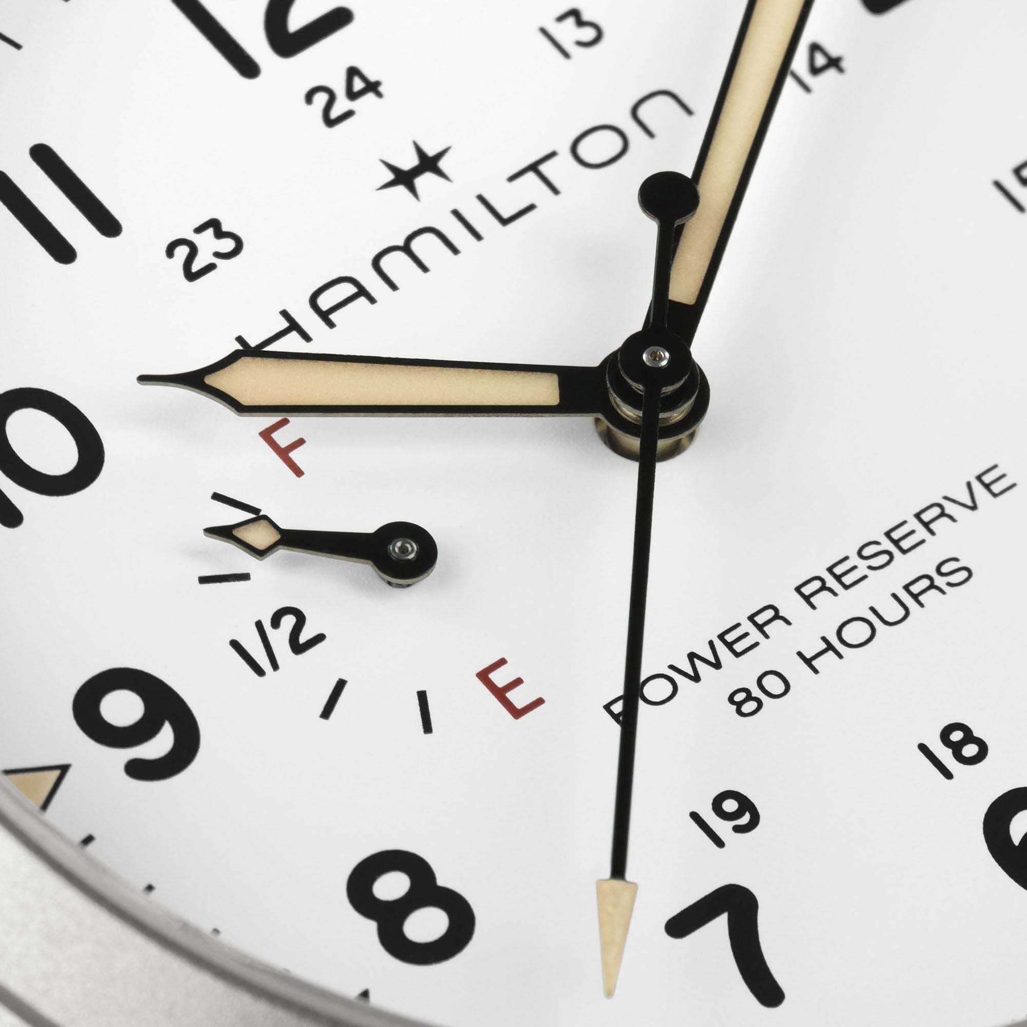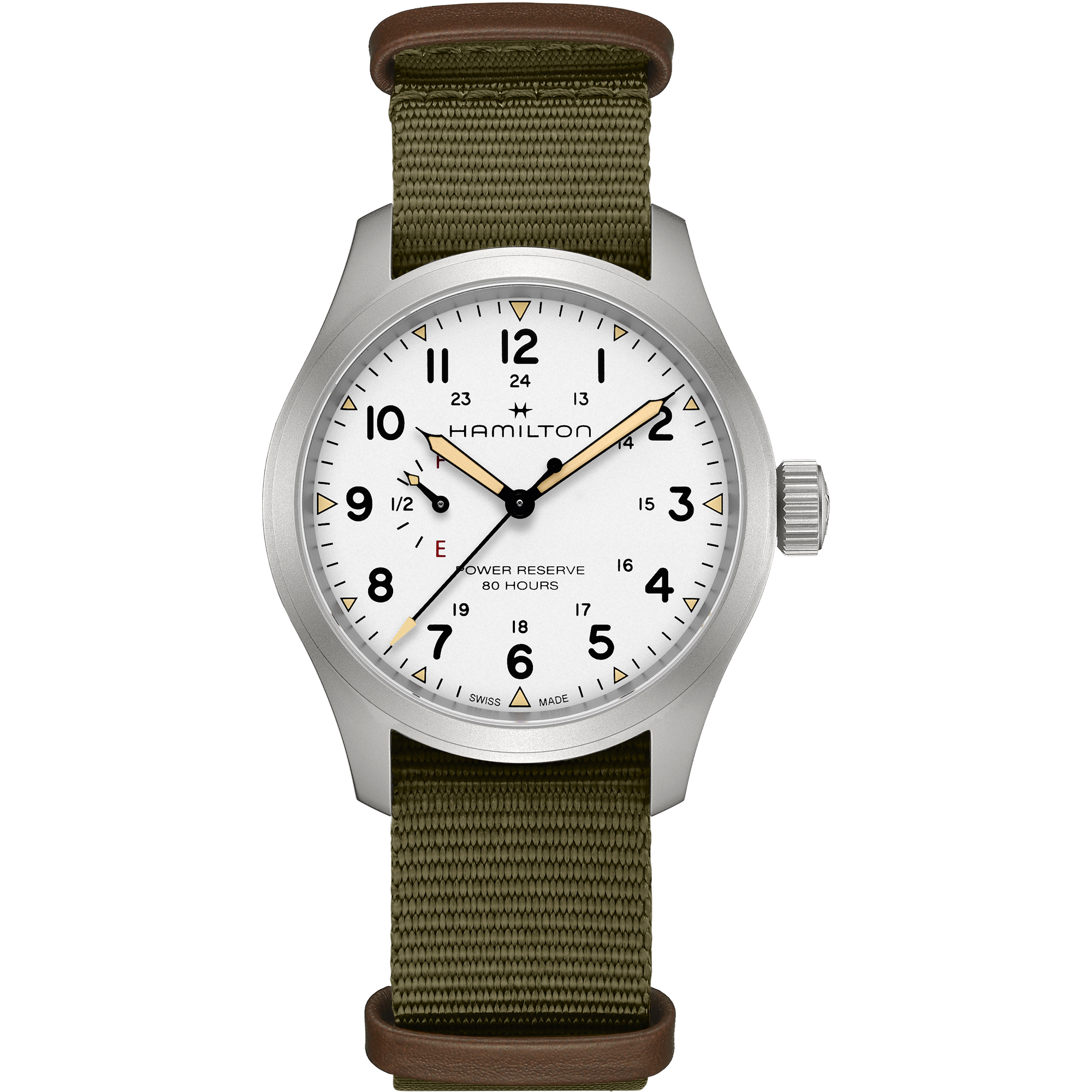 The Khaki Field Mechanical Power Reserve 40mm honors the heritage design and essential functionality of the Khaki family, while introducing modern features and the latest in watchmaking technology and innovation. With a new manual-winding H-23 movement, developed by ETA exclusively for Hamilton, it allows (for the first time) for the 80-hour power reserve to be visualized directly on the dial. Fitted with a rugged khaki green NATO strap, the white dial proudly displays "power reserve 80 hours" and shows "F" for full and "E" for empty, to underscore this exceptional and utility-focused feature.